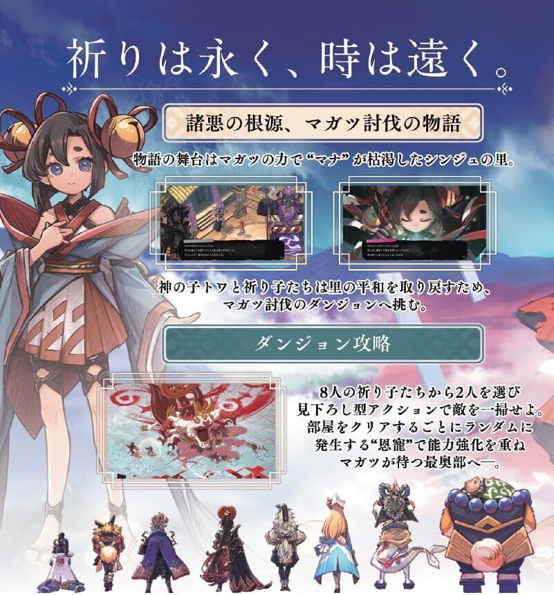 8人の祈り子たちから2人を選び、刀と法術を駆使した見下ろし型のハイスピードアクションで部屋内の敵を一掃せよ。