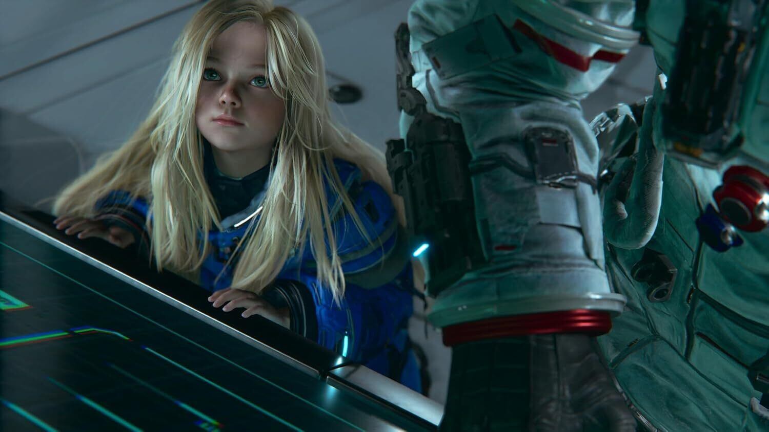 宇宙服姿のヒューとアンドロイドの少女ディアナ。
